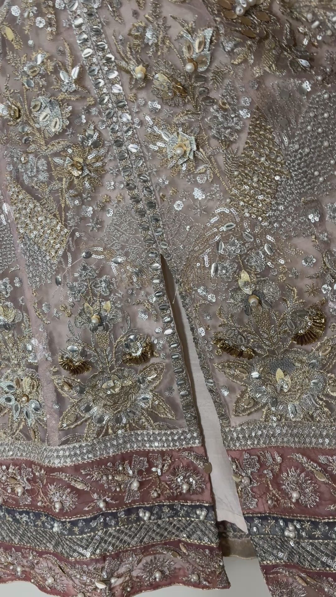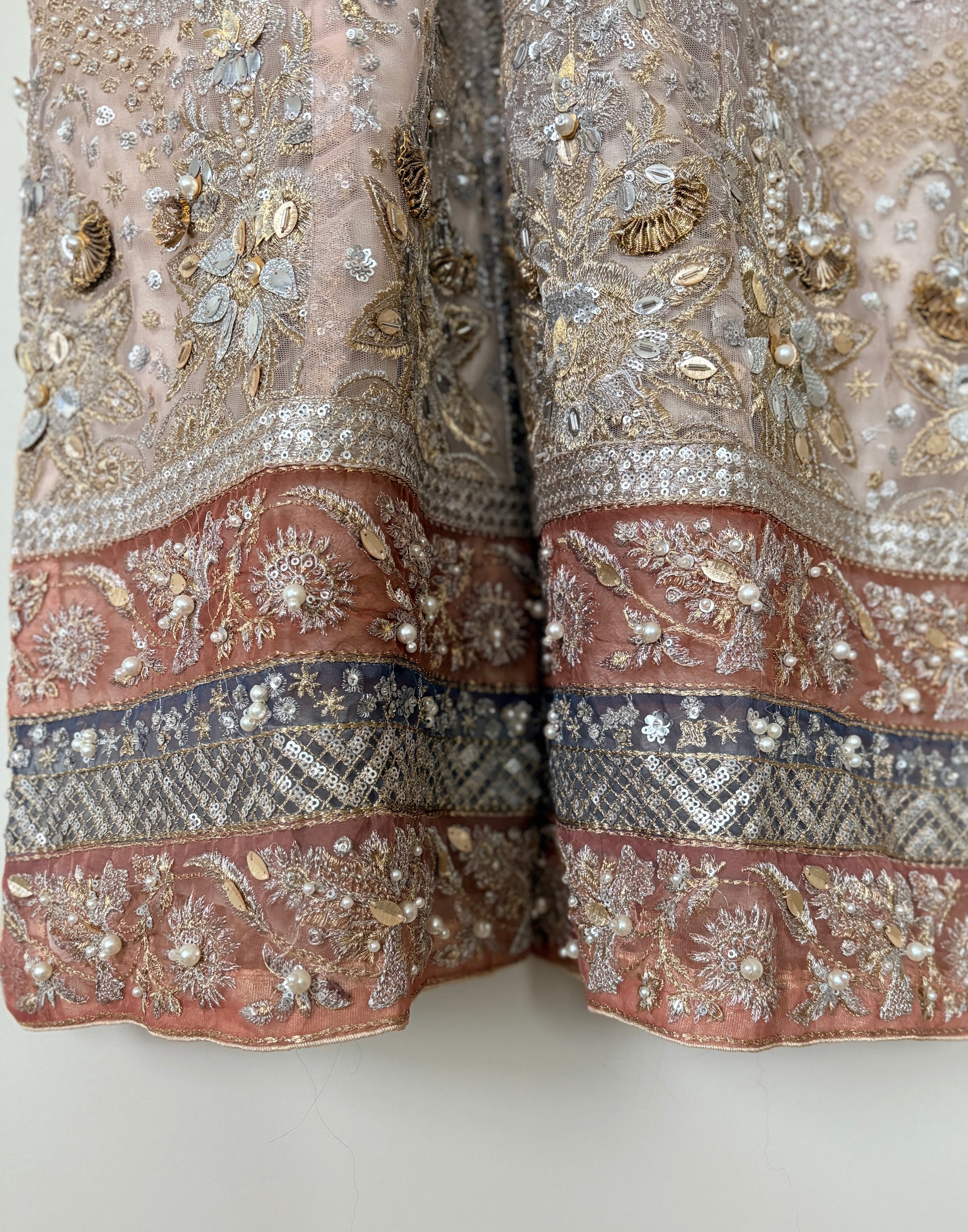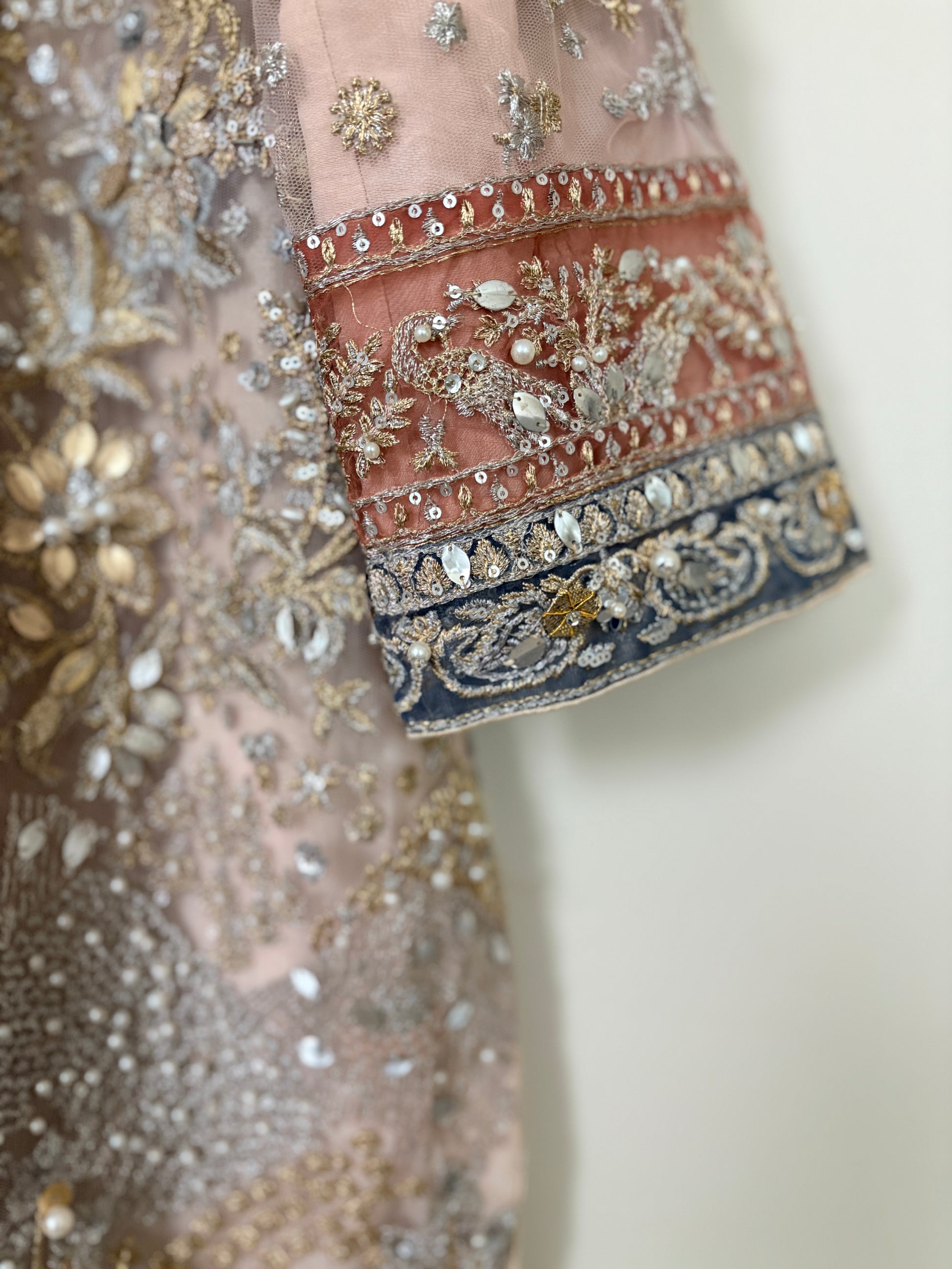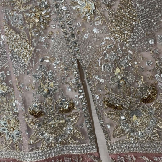 Rendered on a blissful elysian blush canvas, ‘Ceyda’ features an all over delicately embroidered jaal laden with floral sequins, shimmering tobacco, iridescent pearls and meticulously hand placed gold abs silver gota. Accompanied by an array of exquisite borders in tones of rose pink, celadon and Tiffany blue this versatile unstitched design can be stitched as a long or short heavily filigreed jacket. A multi toned lusciously gold leafed dupatta adds colour and festivity making this grand design one of our favourites in the collection.