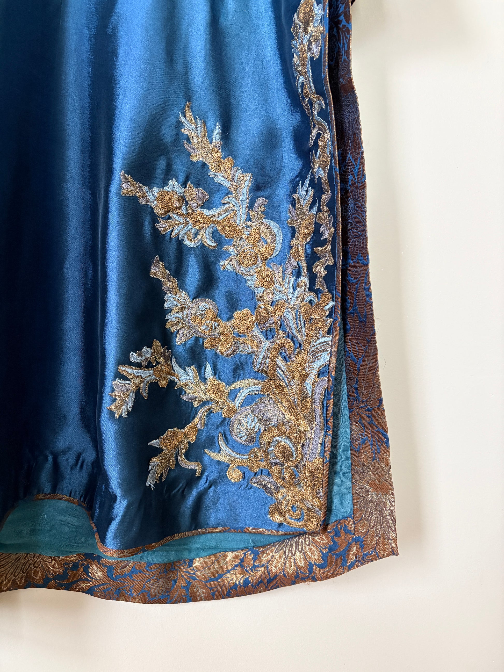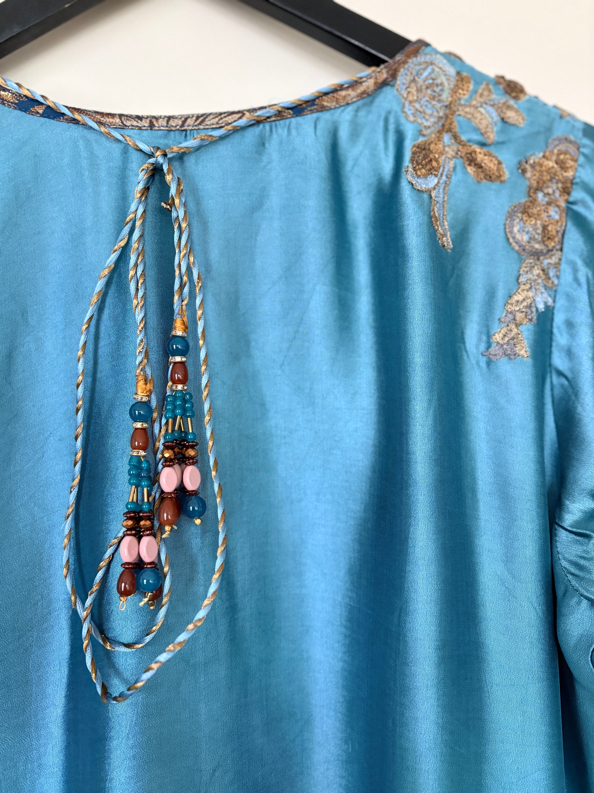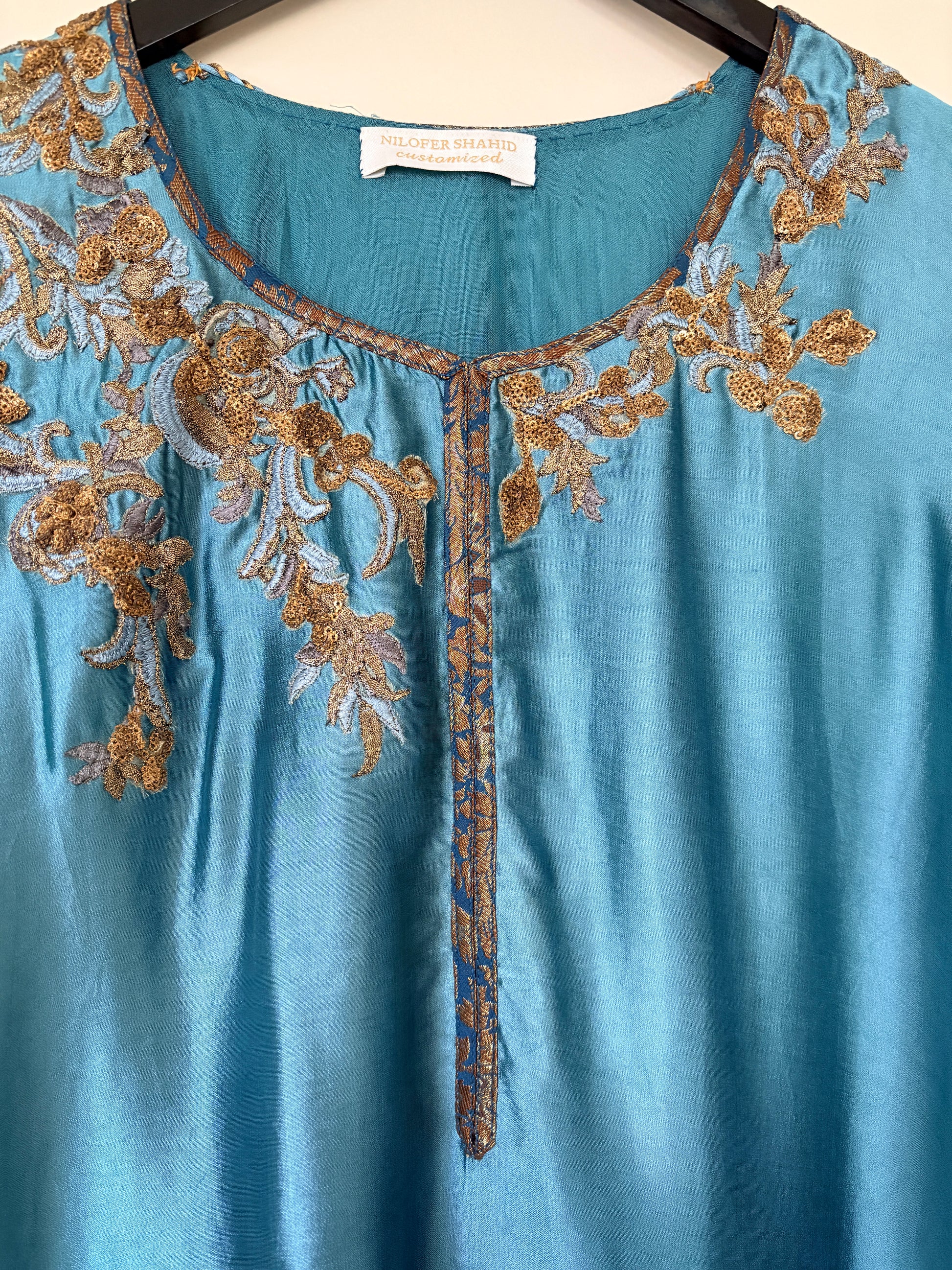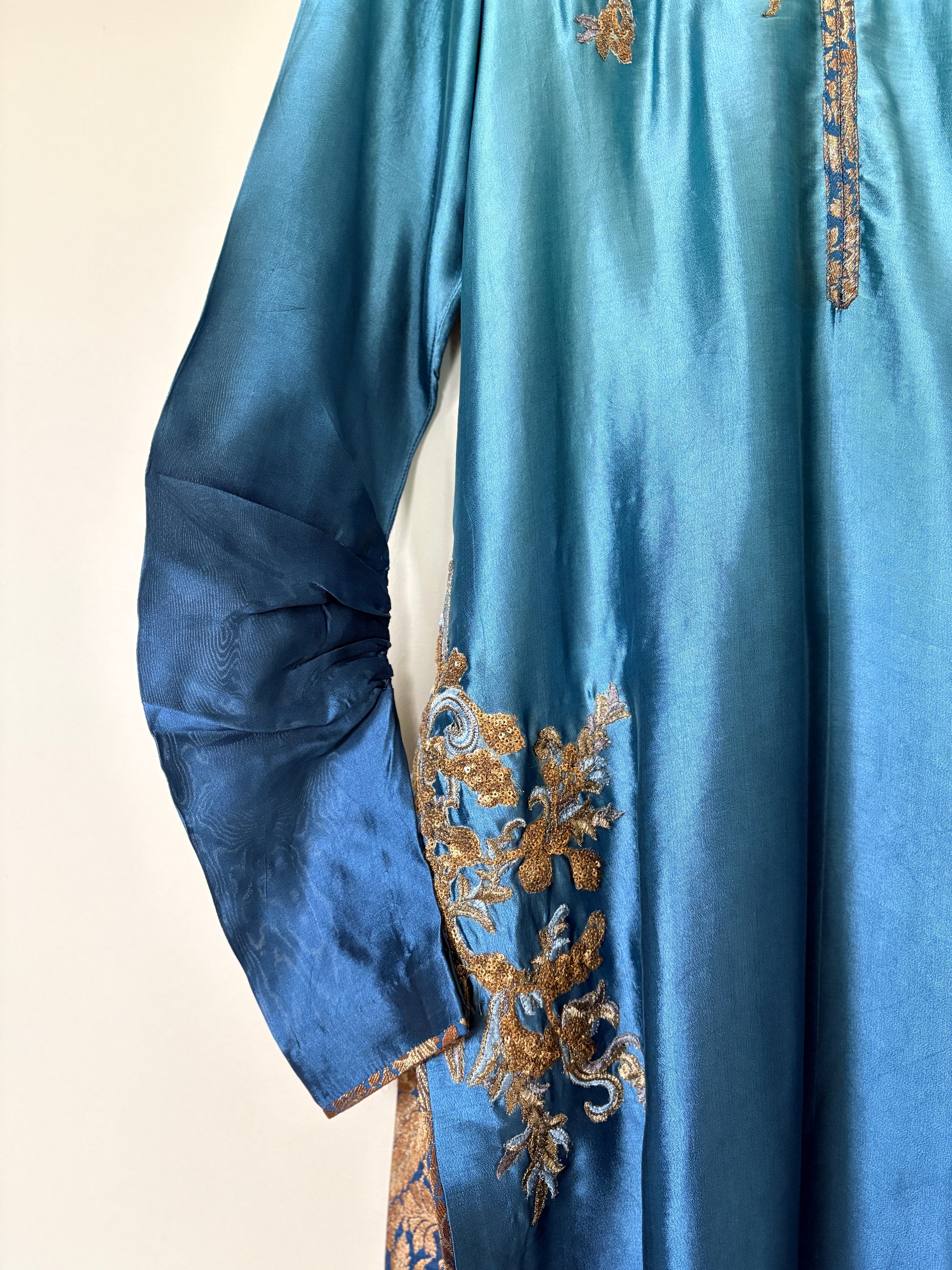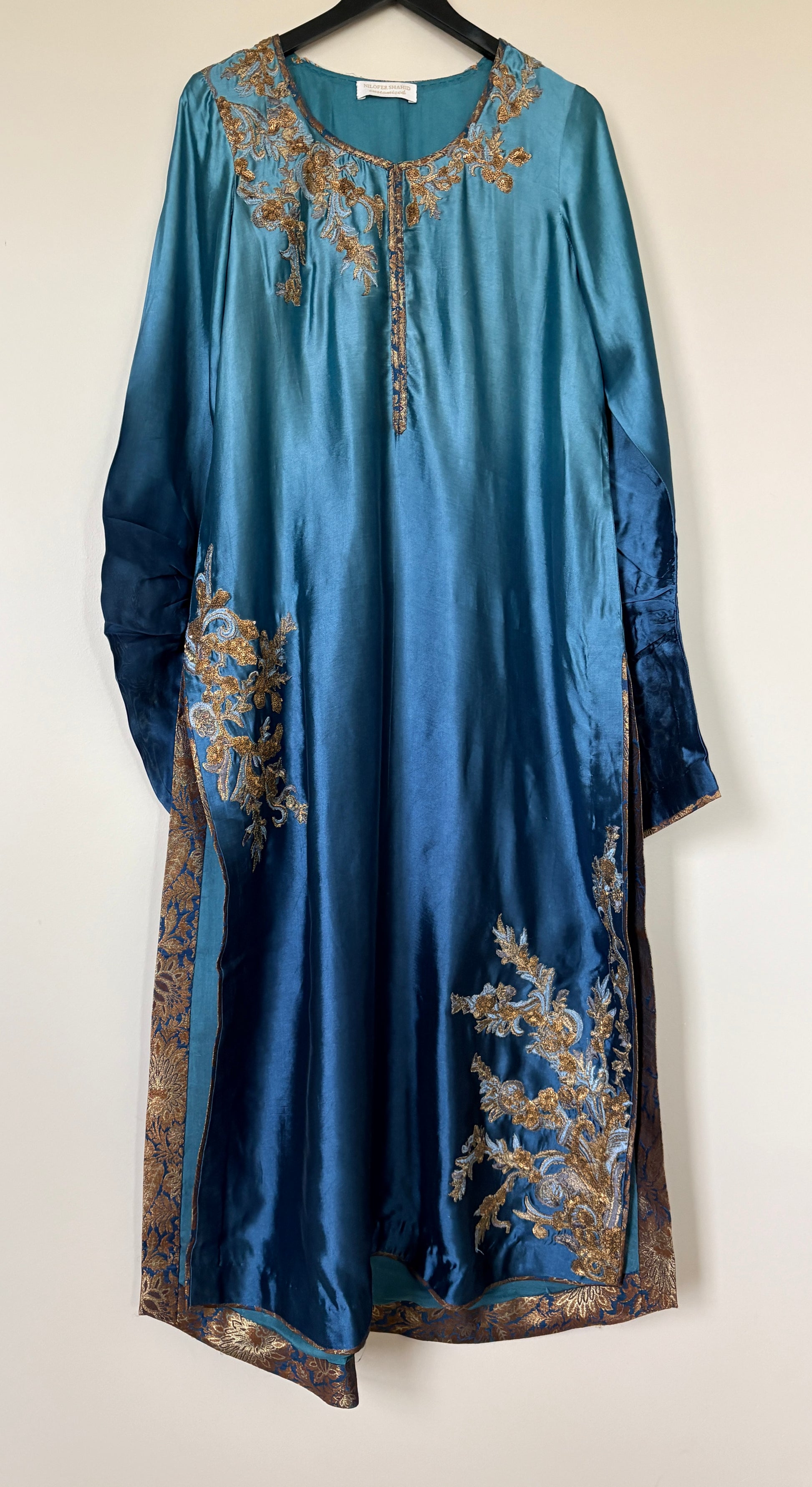 Outshine this Eid with this new sensation from Nilofer Shahid. The Raw Silk fabric is delicately fashioned with our special NS silk blend, thread, and tilla embroidery. The shaded colour flows fluently and the gorgeous long sleeves make it a must have ensemble