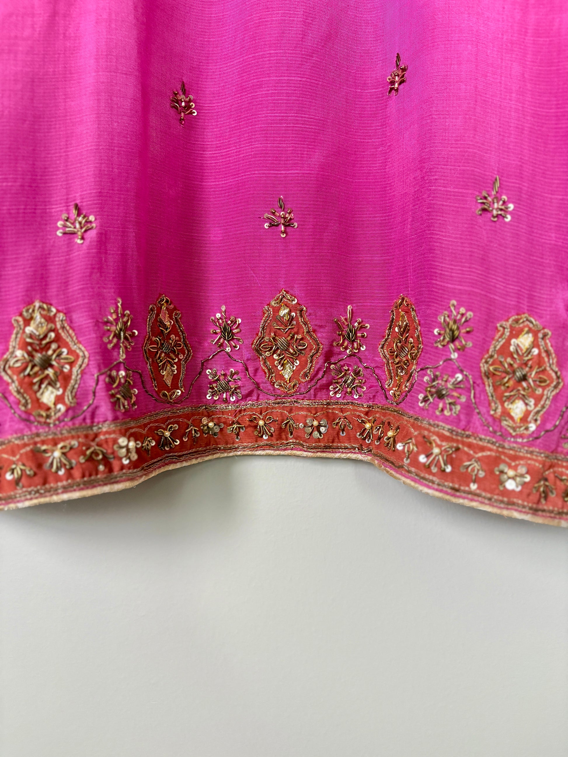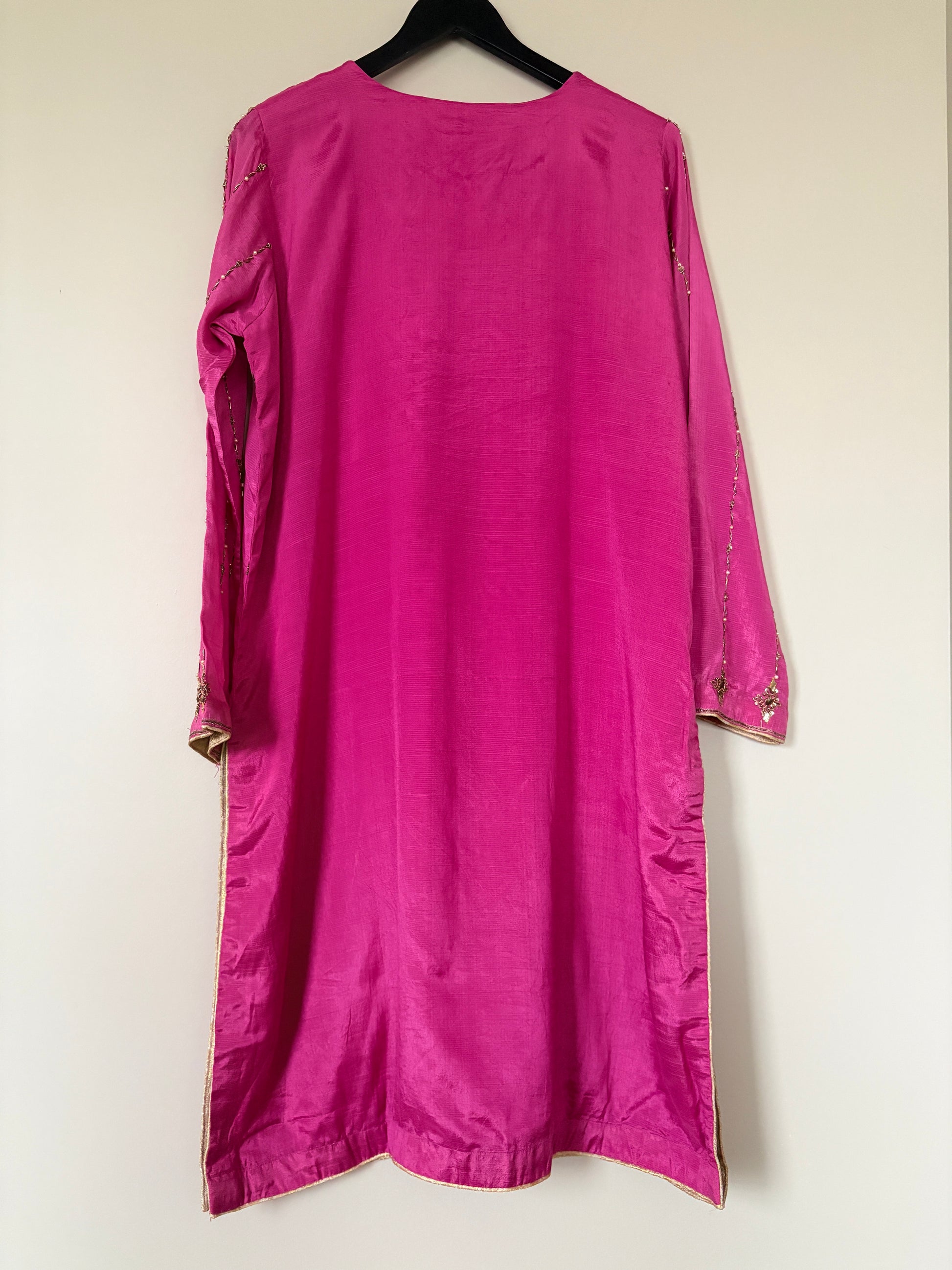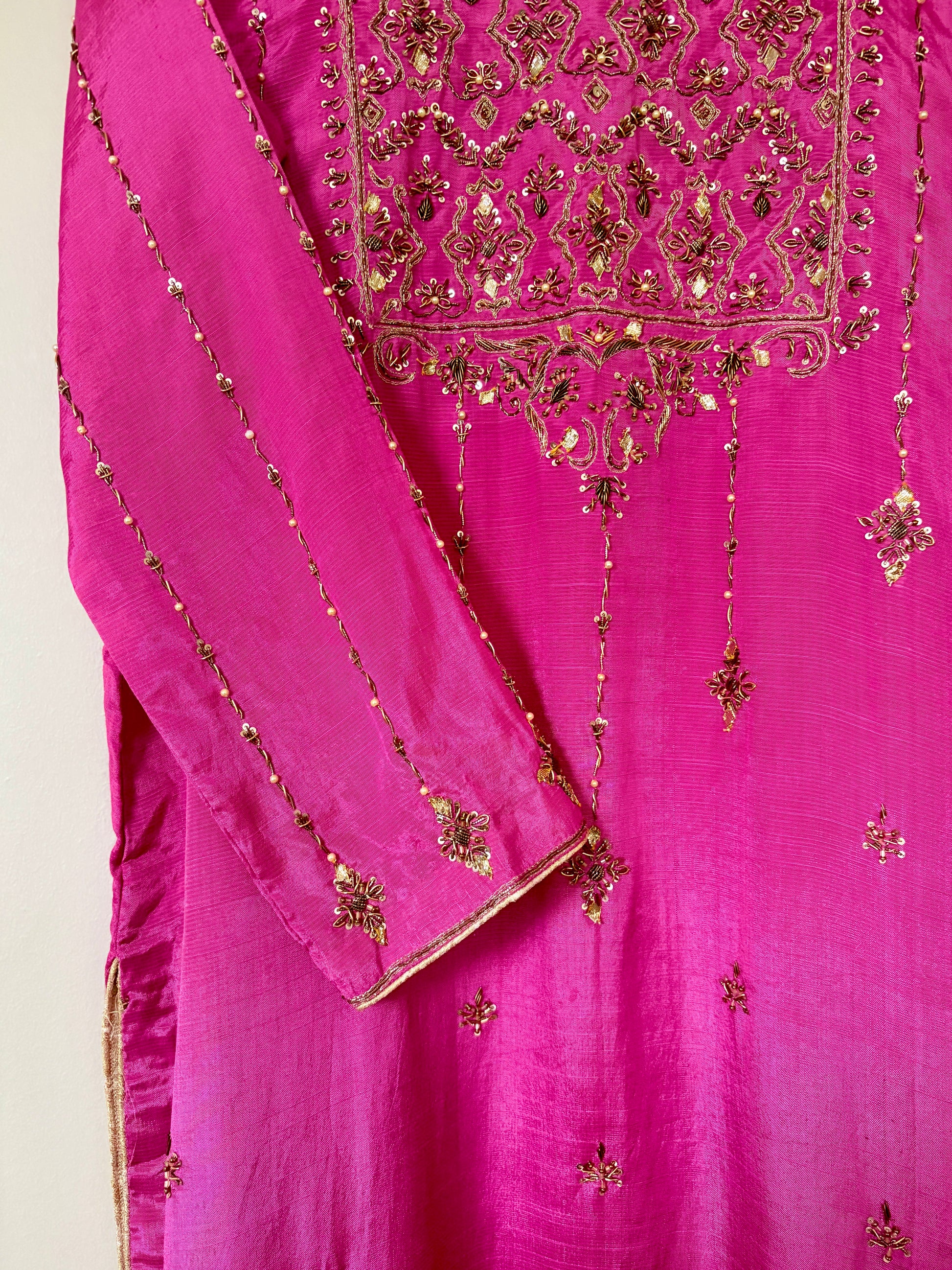 'Balle Balle' Ready to wear three piece dress in shades of pink and burnt orange. Intricate, gold hand embroidered shirt and shalwar, paired with net detailed heavy embroidery dupatta with chan and banarsi off-white paltawa.