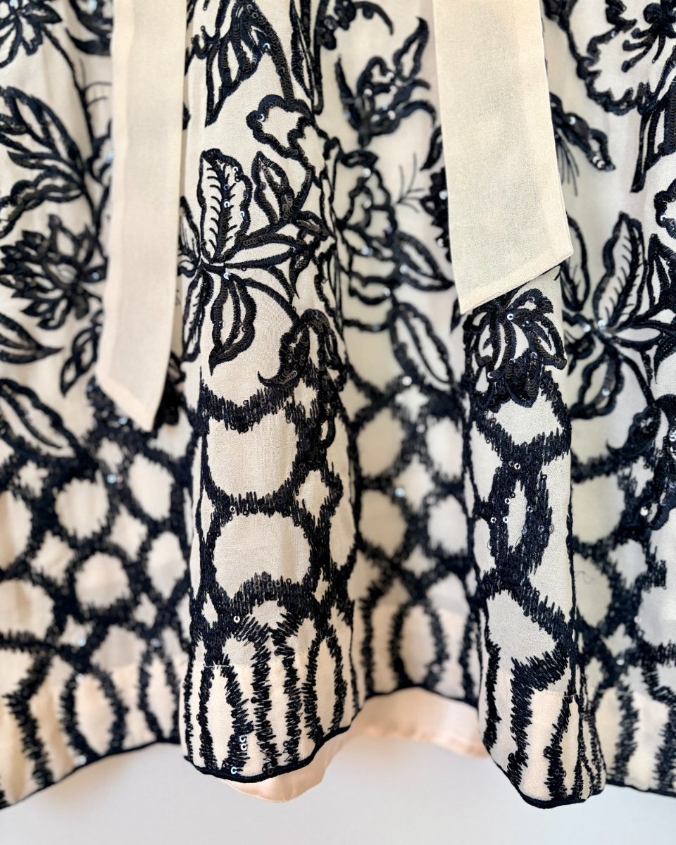 Tie-neck shirt with front embroidery on a flowy fabric.